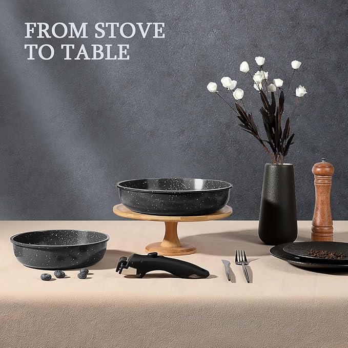 • Convenient Cookware Set - Removable handle for the ultimate versatility– go from all kinds of stoves to the oven, to the grill, to the fridge, and onto the dinner table in a click