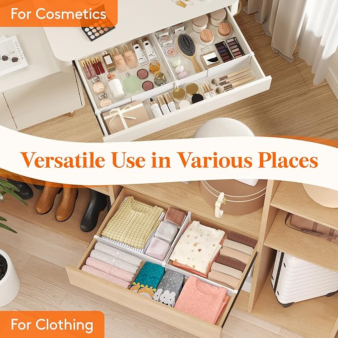 • Expandable and Adjustable: With a 0.4-inch (1cm) thickness and 3.1-inch (7.9 cm) height, plus an adjustable length of 10 to 16.9 inches (25.3 to 42.9cm), our drawer organizer fits most drawers. Please measure your drawer before purchasing