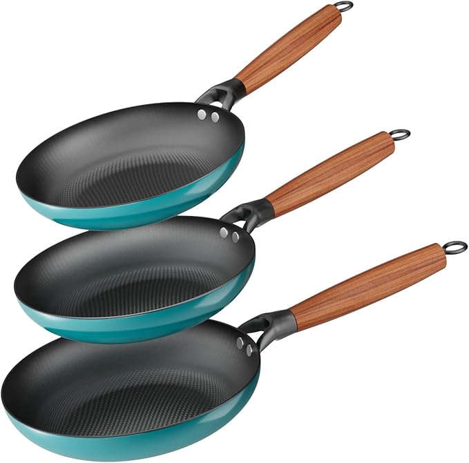 • NON-STICK FRYING PAN SET FOR EVERYDAY COOKING: The skillet comes in three sizes (8'', 10'' and 12''). The 8 inch enameled cast iron frying pan is a solid choice for cooking eggs and omelettes, 10 inch frying pan is a must-have for any home cook, and the 12 inch size offers ample cooking space for family meals or meal prepping.