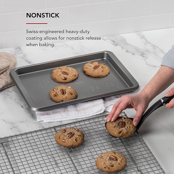 • DURABLE: long-lasting pan is nonstick, oven-safe, heavy-duty aluminized steel pan stands up to high heat for all your baking needs; features a uniquely designed rim to prevent warping
