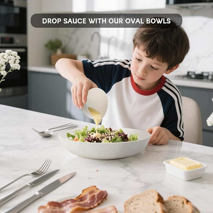 • 【𝗘𝗹𝗲𝘃𝗮𝘁𝗲𝗱 𝗦𝗮𝗹𝗮𝗱 𝗘𝘅𝗽𝗲𝗿𝗶𝗲𝗻𝗰𝗲 𝘄𝗶𝘁𝗵 𝗧𝗵𝗼𝘂𝗴𝗵𝘁𝗳𝘂𝗹 𝗗𝗲𝘀𝗶𝗴𝗻】- Our generously wide wheat straw bowls combine the capacity of deep dishes with the elegant presentation of platters, creating the perfect culinary stage to showcase vibrant ingredients. The wheat straw bowl depth ensures visually appealing salad arrangements while accommodating generous portions.What's more,our sauce bowls design with a oval shape to catch more sauce and easy to pour out along a single point.