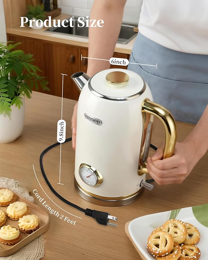 • Retro Design with Modern Features: This retro electric kettle combines vintage aesthetics with modern functionality. It adds a touch of elegance to your kitchen while offering efficient boiling performance. The vintage dial thermometer lets you easily monitor water temperature and achieve perfect brewing results