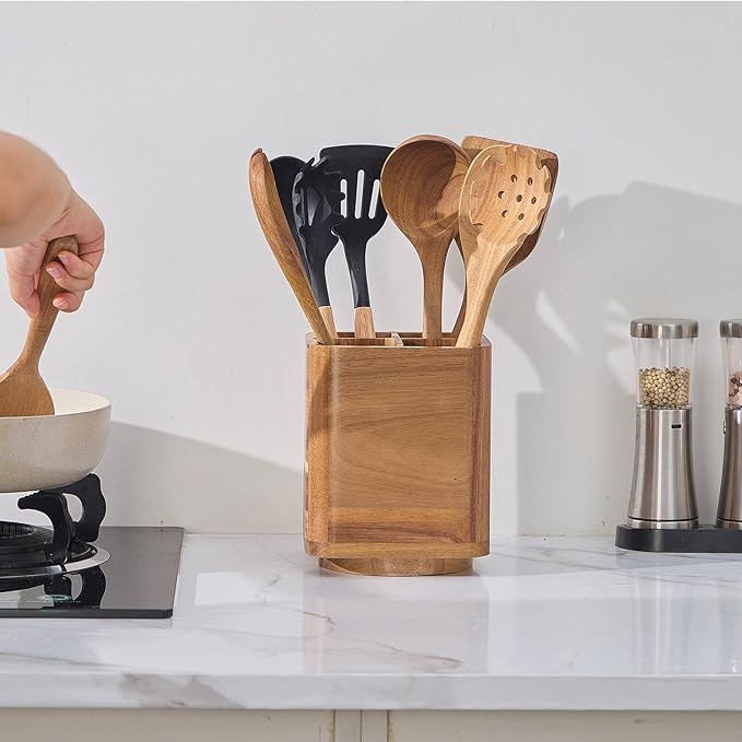 • LARGE AND STURDY UTENSIL CROCK - Our utensil crock is deep and large enough to hold more than 15 cooking utensils, keeping your kitchen organized and clutter-free. The kitchen utensil holder made from Acacia wood, this is designed to last and be sturdy enough for years of use.