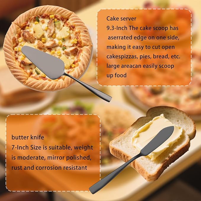 • 5 Piece Serving Utensils Set: Serving spoons x1 (9 inches) , slotted spoons x1 (9 inches) , serving fork x1 (9 inches) , cake server x1 (9.3 inches) , butter knife x1 (7 inches)
