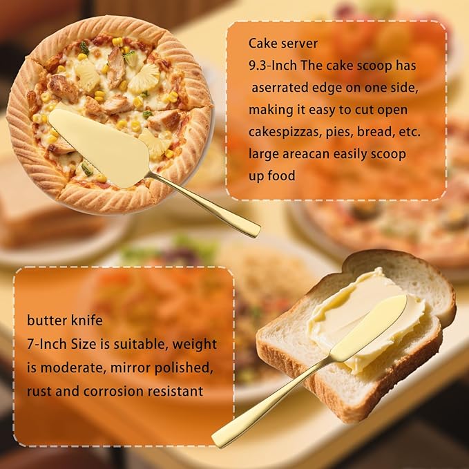 • 5 Piece Serving Utensils Set: Serving spoons x1 (9 inches) , slotted spoons x1 (9 inches) , serving fork x1 (9 inches) , cake server x1 (9.3 inches) , butter knife x1 (7 inches)