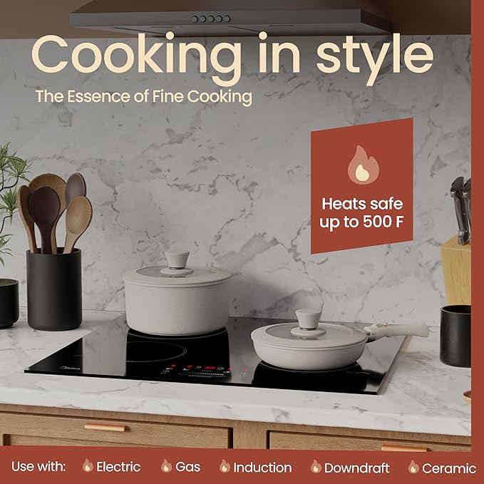 • ALL-STOVE COMPATIBLE – This pots and pans works with gas, electric, ceramic, and induction stovetops. The see-through tempered glass lids with silicone rims let you monitor your food without losing moisture and flavor.