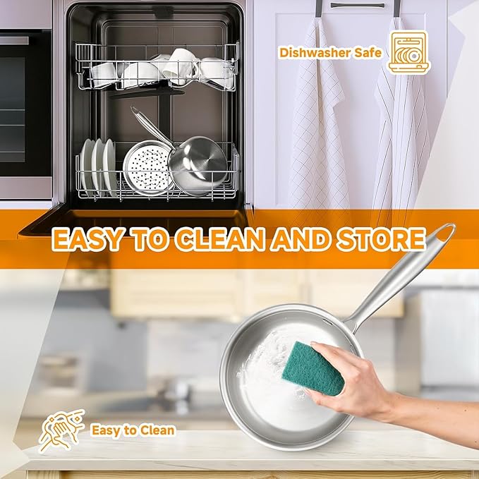 • Heavier and thicker than ordinary 2.5 quart non stick saucepan with lid! Thick fully clad three-layer steel material, combined with the high-side and round-rim design, enables the non-stick sauce pot to have rapid heat conductivity and durable performance, ensuring that the soup is less likely to spill over even after hours of boiling. The non-toxic cooking pot can still maintain its performance. With the lid on, it remains warm for a long time after being cooked.