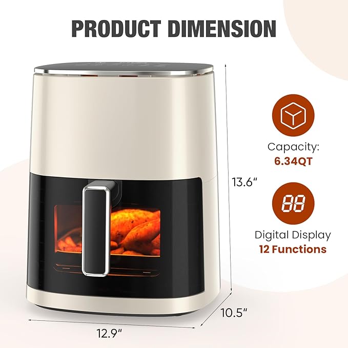 • Clear Viewing Window: Allows you look food without opening the air fryer, helping to maintain consistent temperature and cook times for perfectly crispy results.