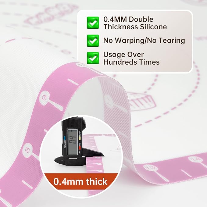 • ใ€๐Ÿช ๐—–๐—ต๐—ฒ๐—ณ-๐—”๐—ฝ๐—ฝ๐—ฟ๐—ผ๐˜ƒ๐—ฒ๐—ฑ ๐—ก๐—ผ๐—ป-๐—ฆ๐—น๐—ถ๐—ฝ ๐—•๐—ฎ๐—ธ๐—ถ๐—ป๐—ด ๐— ๐—ฎ๐˜ ๐ฐ๐ข๐ญ๐ก ๐Ÿ๐ŸŽ ๐ฎ๐ฌ๐ž๐Ÿ๐ฎ๐ฅ ๐‘๐ž๐œ๐ข๐ฉ๐ž๐ฌใ€‘๏ผšUpgraded food-grade silicone with deep grid texture prevents shifting during rolling, more grip than standard mats (tested at 480ยฐF). Perfect for macarons, cookies, Pizza and pastry doughโ€”no more messy flour dusting!
